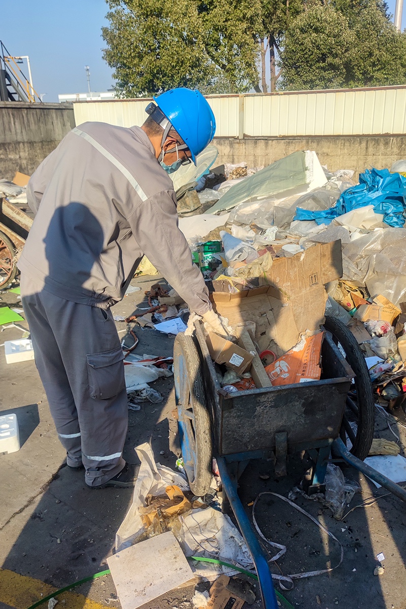 義工們分為兩組,通力配合、迅速展開清掃工作。清理石塊小組用鐵鎬和掃帚小心翼翼地挖掘地面上的石頭,將它們挖出運(yùn)走;清除保溫棉小組使用鏟子和掃帚,將保溫材料從地上清理干凈,并將可回收垃圾收集起來。在大家共同努力下,廠區(qū)地面再次變得整潔、平整。