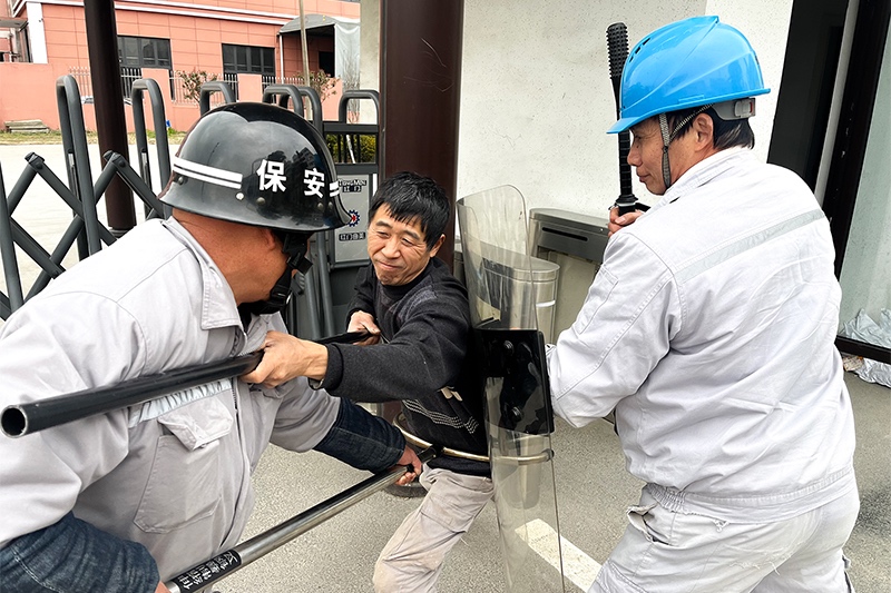 隨后,演練正式開(kāi)始。由一名檢修班員工扮演“可疑人員”,試圖強(qiáng)行闖入廠區(qū),應(yīng)急預(yù)案立即啟動(dòng)。值班保安員馬上穿戴好防暴工具,手持防爆盾、鋼叉等器械,迅速趕赴現(xiàn)場(chǎng)。在大家的默契配合下,安保人員成功將“歹徒”合圍至門衛(wèi)室護(hù)欄上,并最終將其制服。